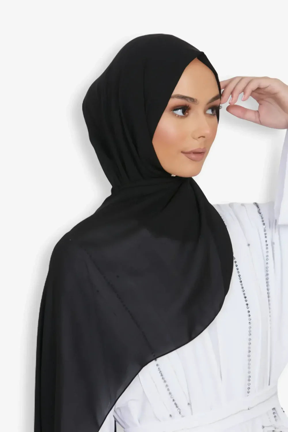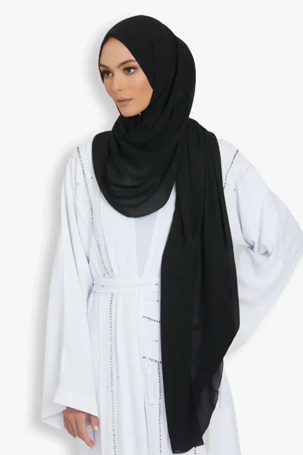 If there’s one hijab you need in your collection, it’s this one Our Black Georgette Hijab is lightweight, soft, and drapes effortlessly—basically, no-fuss styling at its best. The classic black color goes with everything, making it your ultimate go-to for any look, whether you’re keeping it casual or dressing up.